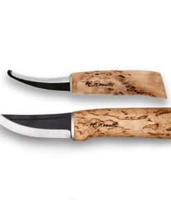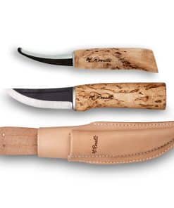 A practical handmade combo sheath with both the Roselli Hunting Knife and Gralloching Knife made of carbon steel and curly birch handle. Perfect gift for the hunter in your life, even if that someone is yourself!