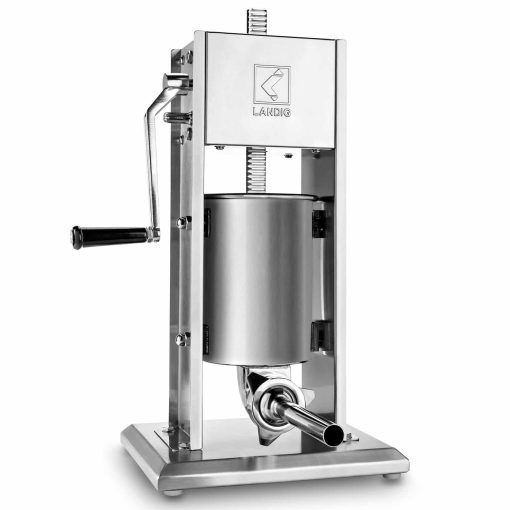 3 liter stainless steel sausage filler from Landig. 3rd generation. Stable, durable construction, with large base plate and 5 stainless steel filling funnels.