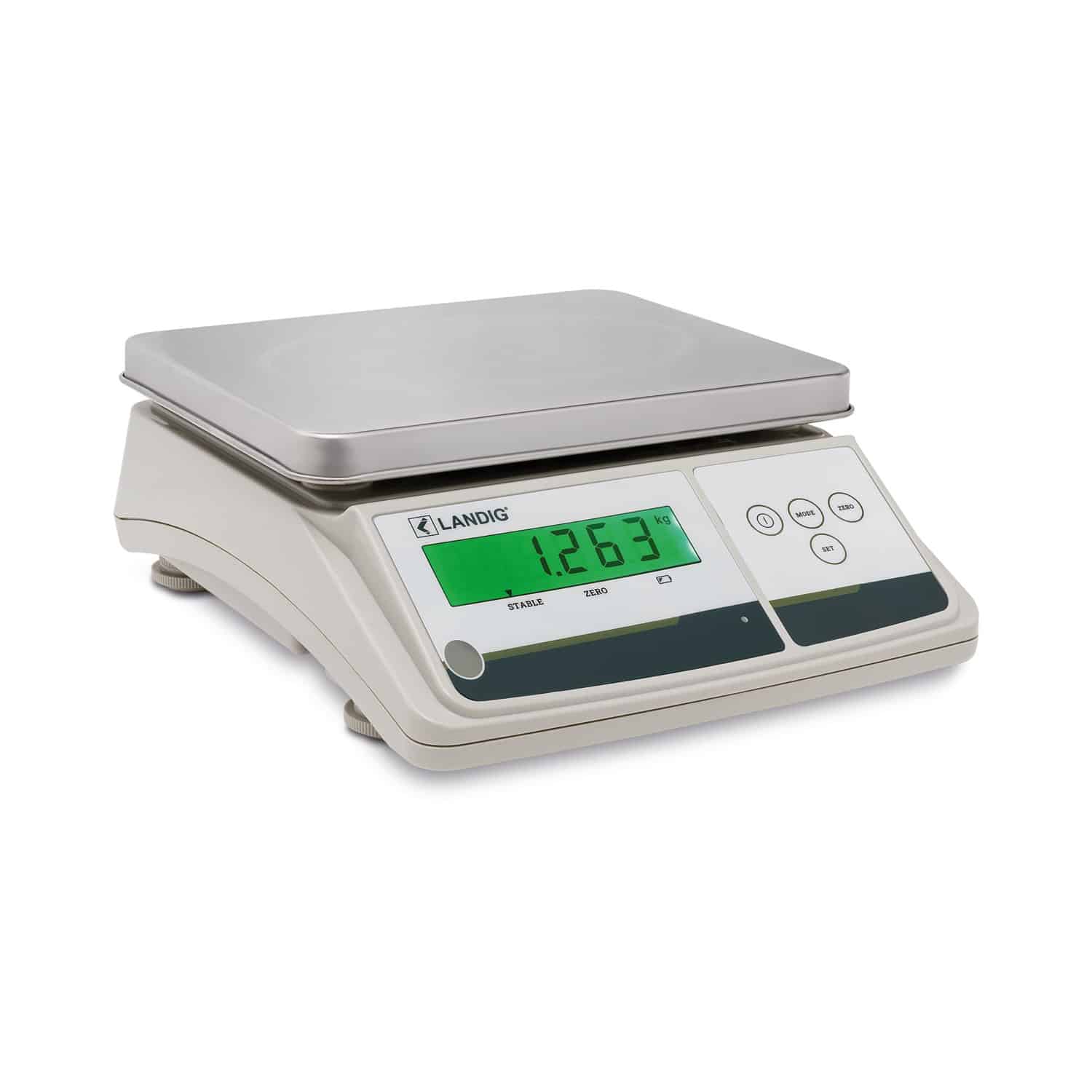 Weighing surface made of stainless steel: 280 x 215 mm (W x D).